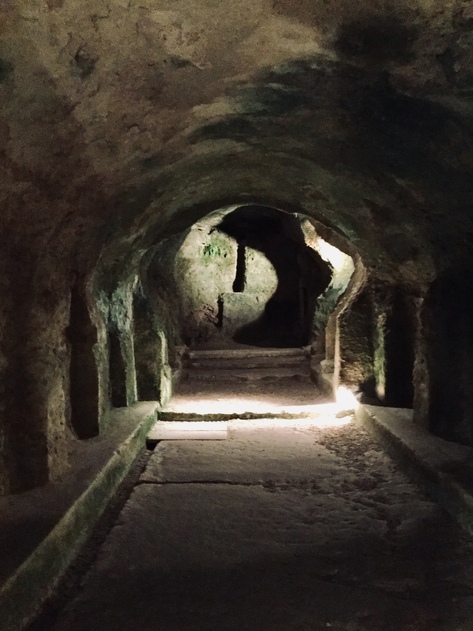 Vous pouvez retrouver dans l’alignement du reliquaire, une fosse creusée dans la roche. Dans cette fosse se trouve une croix grecque. Plus loin, une ouverture impressionnante taillée dans le roc donne accès à la nécropole. Cette nécropole du XIIe siècle s’étend à nos pieds avec 170 tombes rupestres. Elles témoignent de l’importance sacrée du lieu.